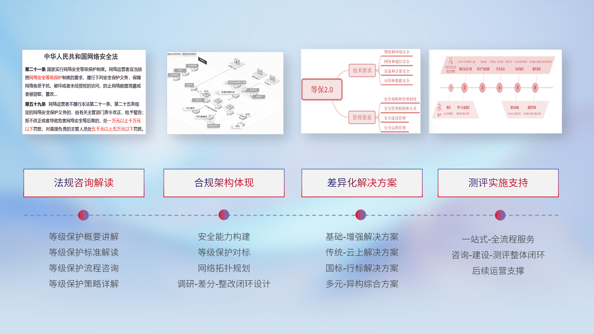 通过专业的法律咨询解读、、合规架构体现、、、差异化解决方案、、、测试实施支持等服务,,为客户量身打造等保合规体系。。。